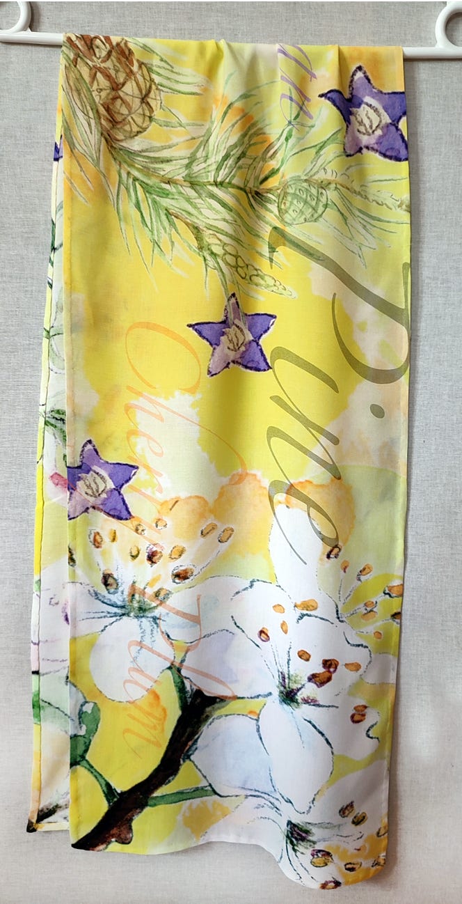 Textildruck auf feine Viskose als Schal mit Aquarell-Illustrationen zu „Bachblüten“ .